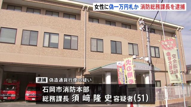 SNSで知り合った女性に偽物の1万円札を渡したとして、茨城県警は石岡市消防本部総務課長の須崎隆史容疑者(51)を偽造通貨行使の疑いで逮捕したと4日、発表した。「渡したことに間違いない」と、容疑を認めているという。