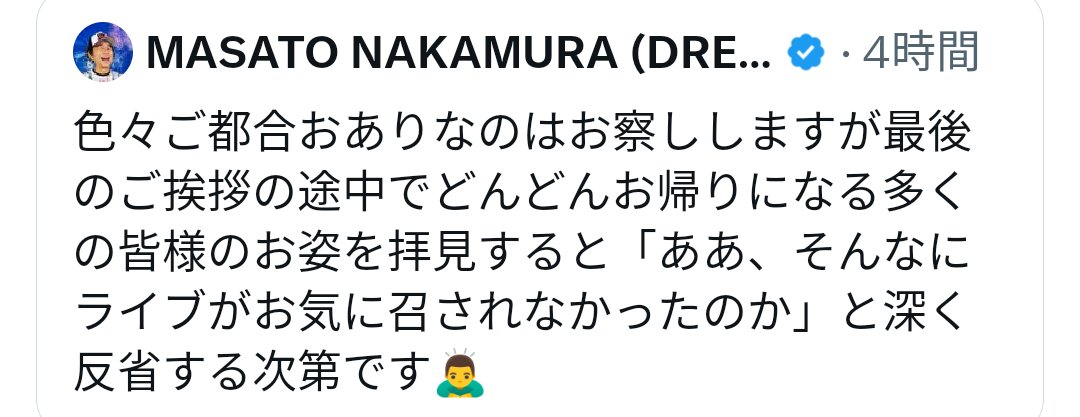 中村さんは7日、ライブの終演後、「色々ご都合おありなのはお察ししますが最後のご挨拶の途中でどんどんお帰りになる多くの皆様のお姿を拝見すると『ああ、そんなにライブがお気に召されなかったのか』と深く反省する次第です」(削除済み)と投稿した。