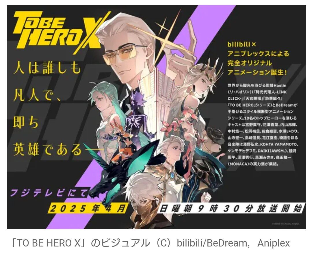 アニプレックスと中国最大級の動画サイト「bilibili」による完全新作オリジナルアニメ「TO BE HERO X」が、2025年4月からフジテレビで毎週日曜午前9時半に放送されることが12月9日、分かった。
