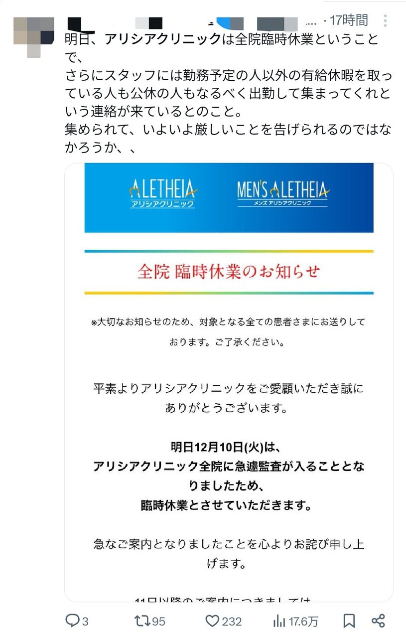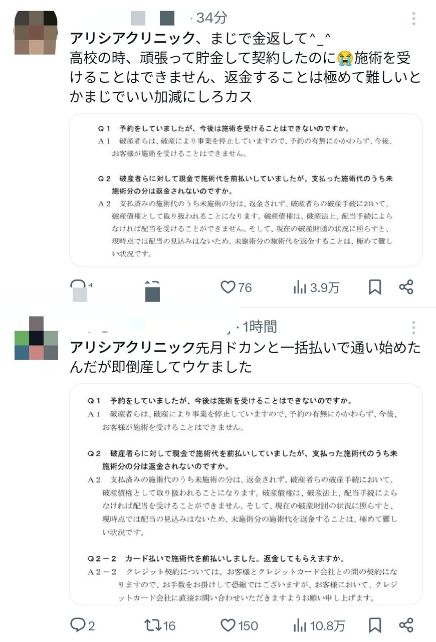 アリシアクリニックの破産は、返金が難しいとの知らせを受け、多くの消費者が怒りと悲しみ、スタッフも突然全員解雇で困惑しています。