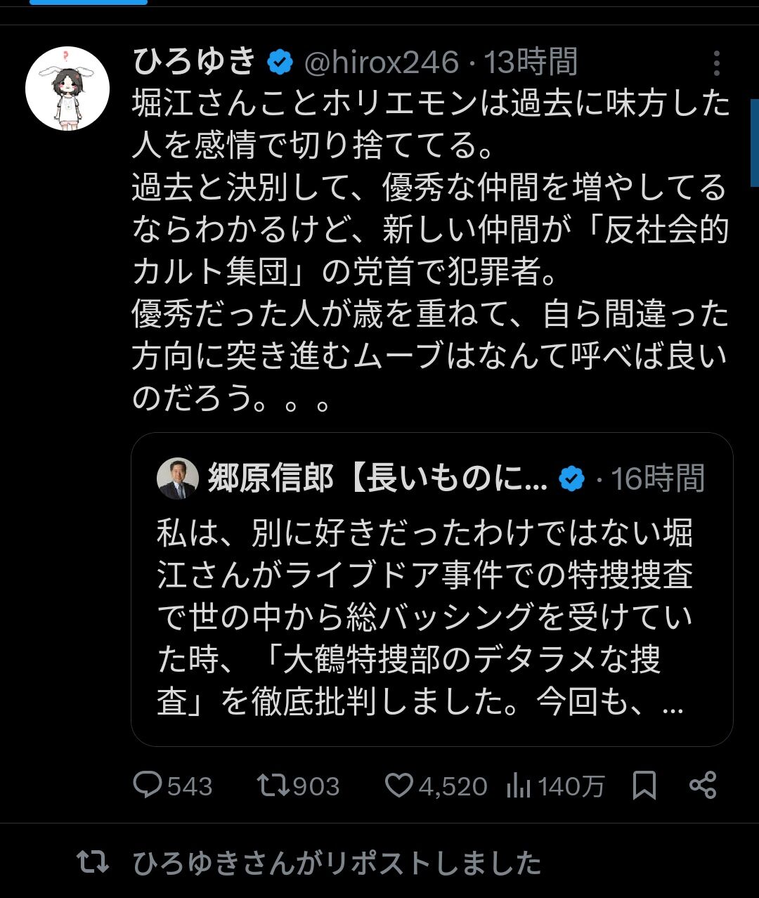 優秀だった人が歳を重ねて、自ら間違った方向に突き進むムーブはなんて呼べば良いのだろう。。。 https://t.co/OtGMOfGYEX— ひろゆき (@hirox246) December 10, 2024