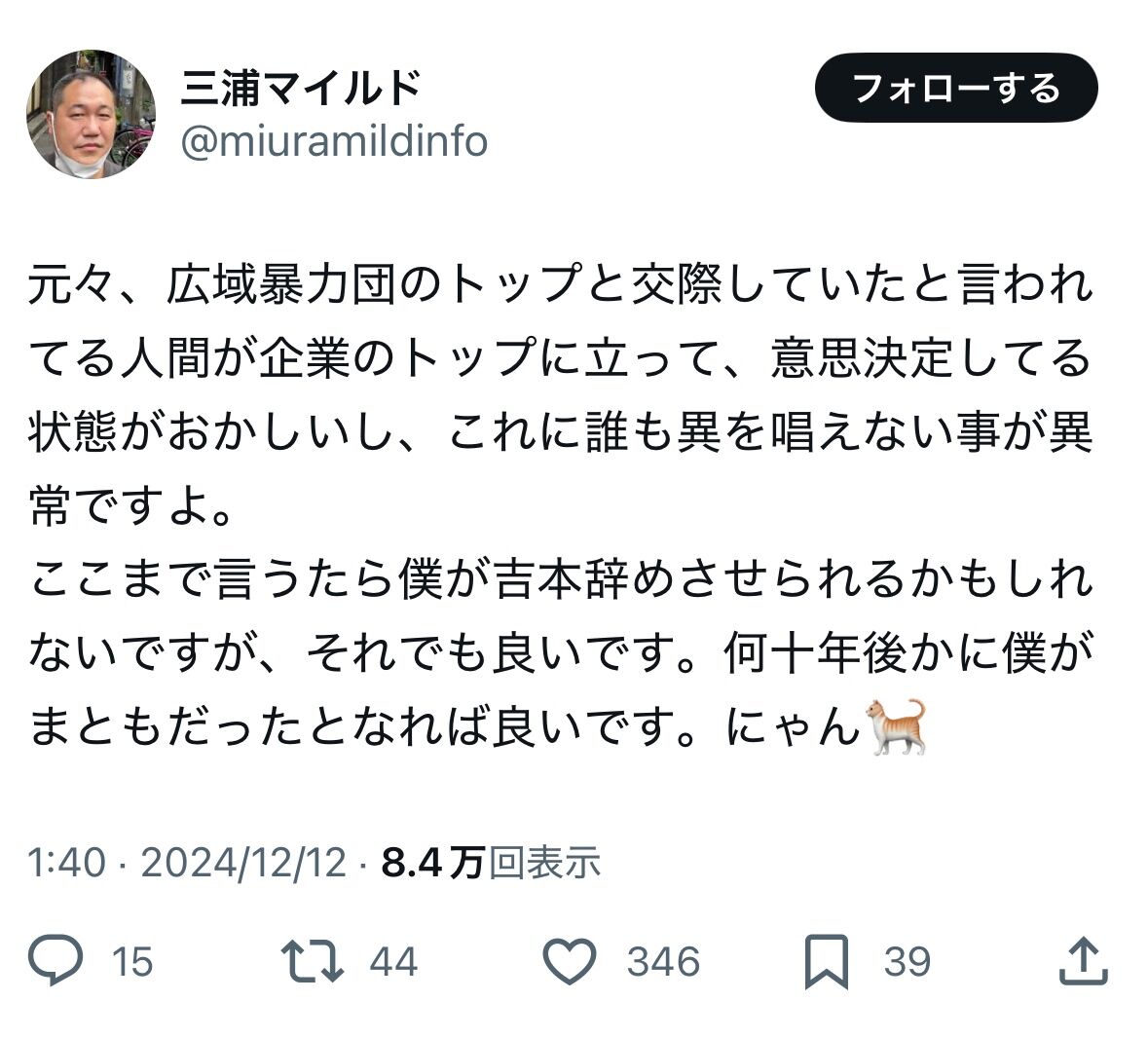 ここまで言うたら僕が吉本辞めさせられるかもしれないですが、それでも良いです。何十年後かに僕がまともだったとなれば良いです。にゃん🐈— 三浦マイルド (@miuramildinfo) December 11, 2024