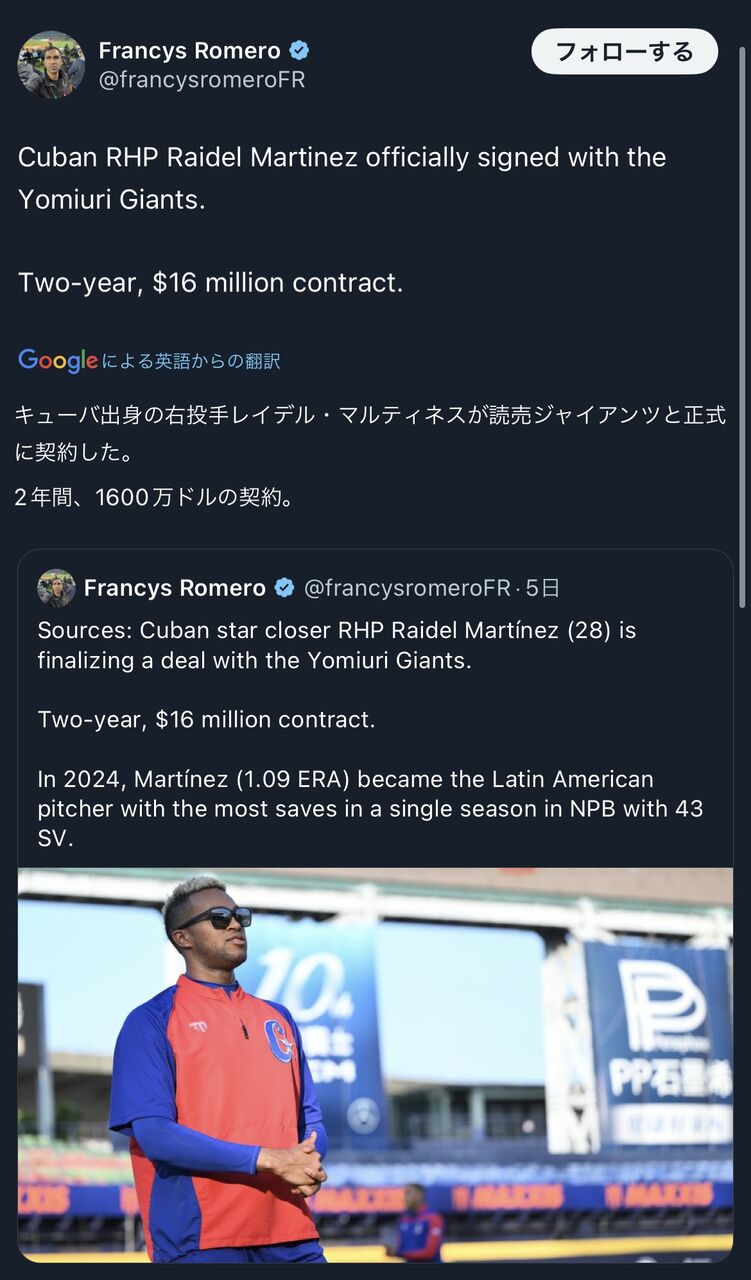 ロメロ記者、巨人とライデルマルティネス正式契約をポスト