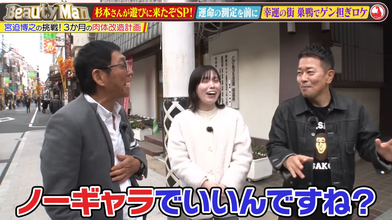 アシスタントを務める元「尼神インター」誠子と共に巣鴨ロケに訪れた宮迫だったが、なにやら怪しげな“一般人”の姿が。宮迫が「すいません、今撮影中なので」と注意すると、その男性はマスクと帽子を外す。なんとその正体はお笑いタレント・明石家さんまだった。