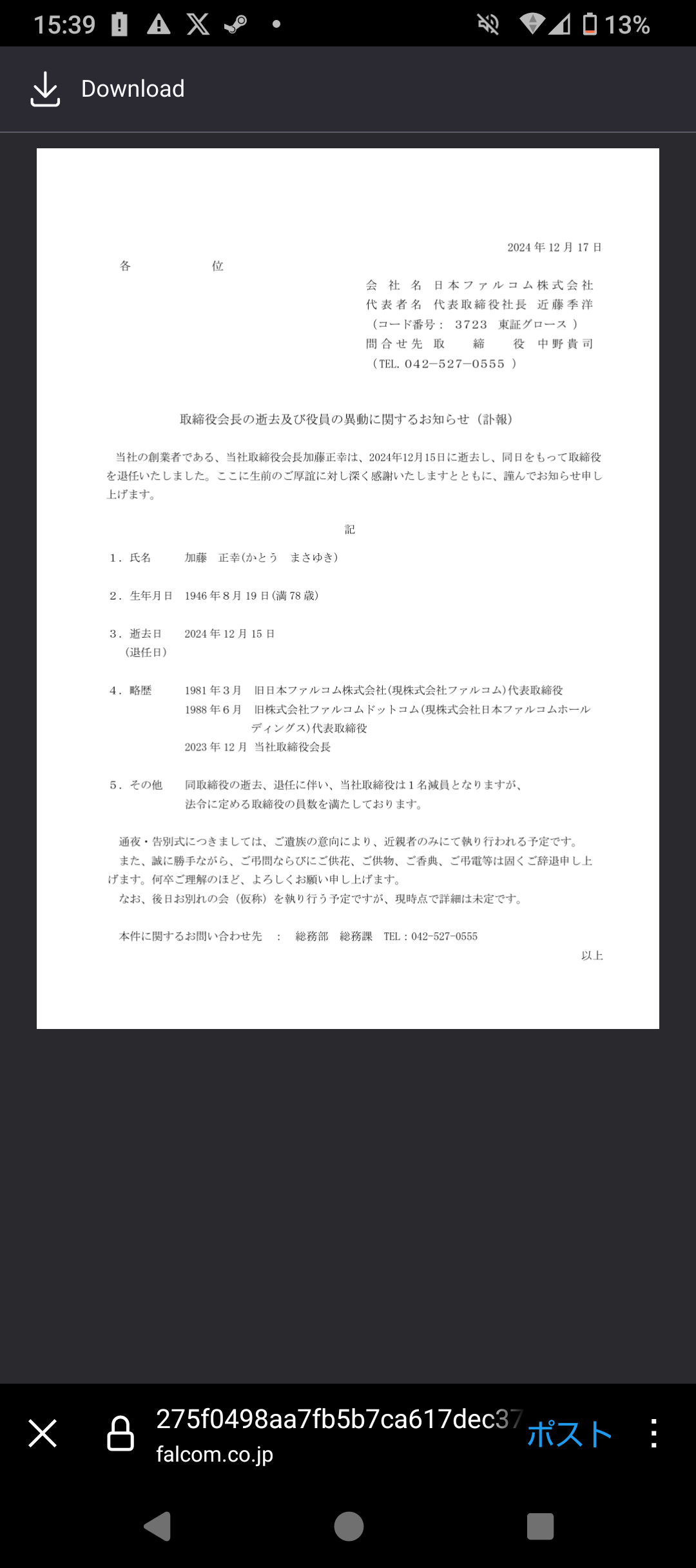 取締役会長の逝去及び役員の異動に関するお知らせ(訃報)を掲載いたしました
