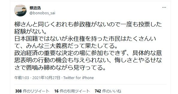 柳美里さんと同じくおれも参政権がないので一度も投票した経験がない。