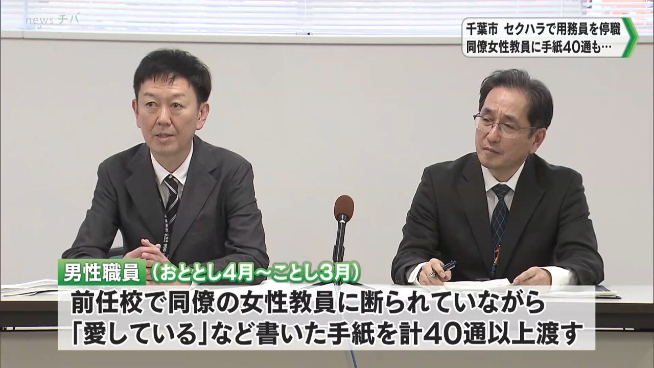 同僚の女性教員に「愛している」などと書いた手紙を渡すセクハラ行為を繰り返したとして、千葉市教育委員会は12月20日、40代の男性職員を停職1か月の懲戒処分としました。
