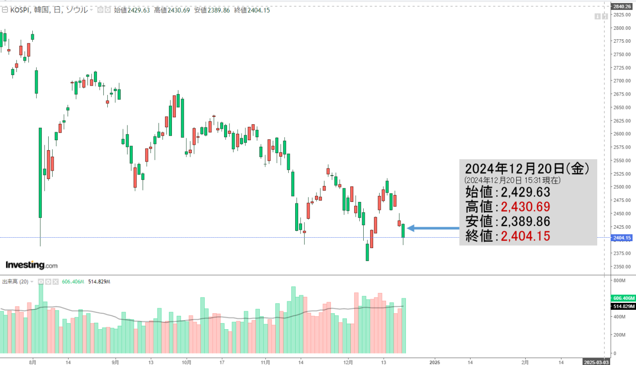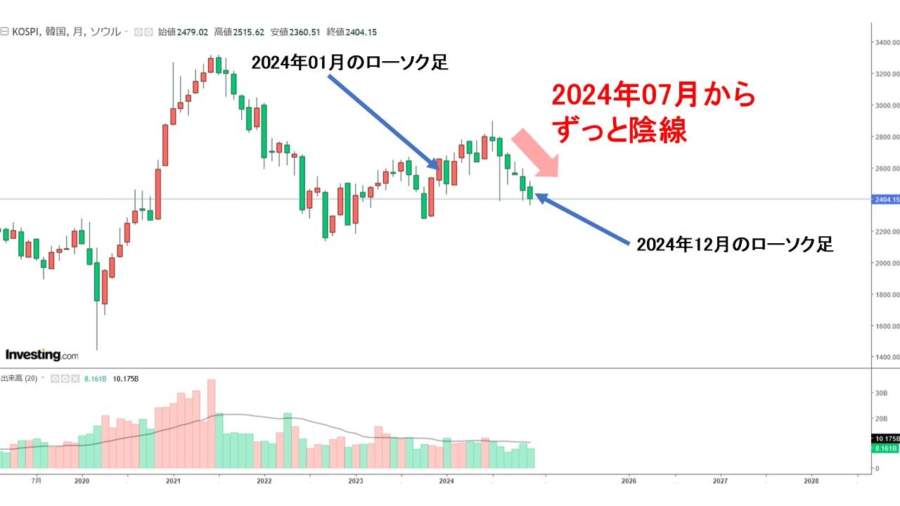 2024年07月以降、KOSPIは下げ続けています。戒厳令騒動があった12月も確かに陰線ですが、そもそもファンダメンタルズが悪いので、上げようがないというのが本当のところです。