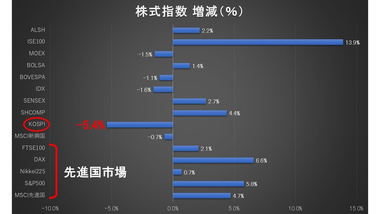 上掲のとおり、先進国株式市場の指数は全部プラスです。ところが、新興国市場の指数の中でも韓国のKOSPIはどこよりも悪いのです。現在戦争を行っているロシアの「MOEX」よりもパフォーマンスが悪いのです。