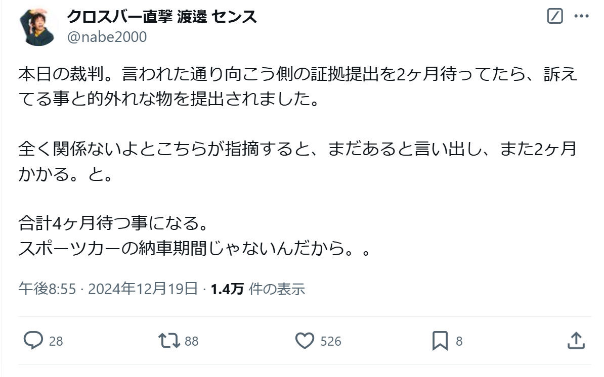 「本日の裁判。言われた通り向こう側の証拠提出を2ヶ月待ってたら、訴えてる事と的外れな物を提出されました」と告白。その上で「全く関係ないよとこちらが指摘すると、まだあると言い出し、また2カ月かかる。と」とつづった。そして「合計4カ月待つ事になる。スポーツカーの納車期間じゃないんだから。。」と締めくくった。