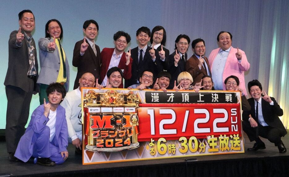 「M-1」決勝進出を決めた9組(左から)エバース、トム・ブラウン、ダイタク、ヤーレンズ、バッテリィズ、ジョックロックの福本ユウショウ、真空ジェシカ(手前)、令和ロマン(後列)、ママタルト、右端がジョックロックのゆうじろー