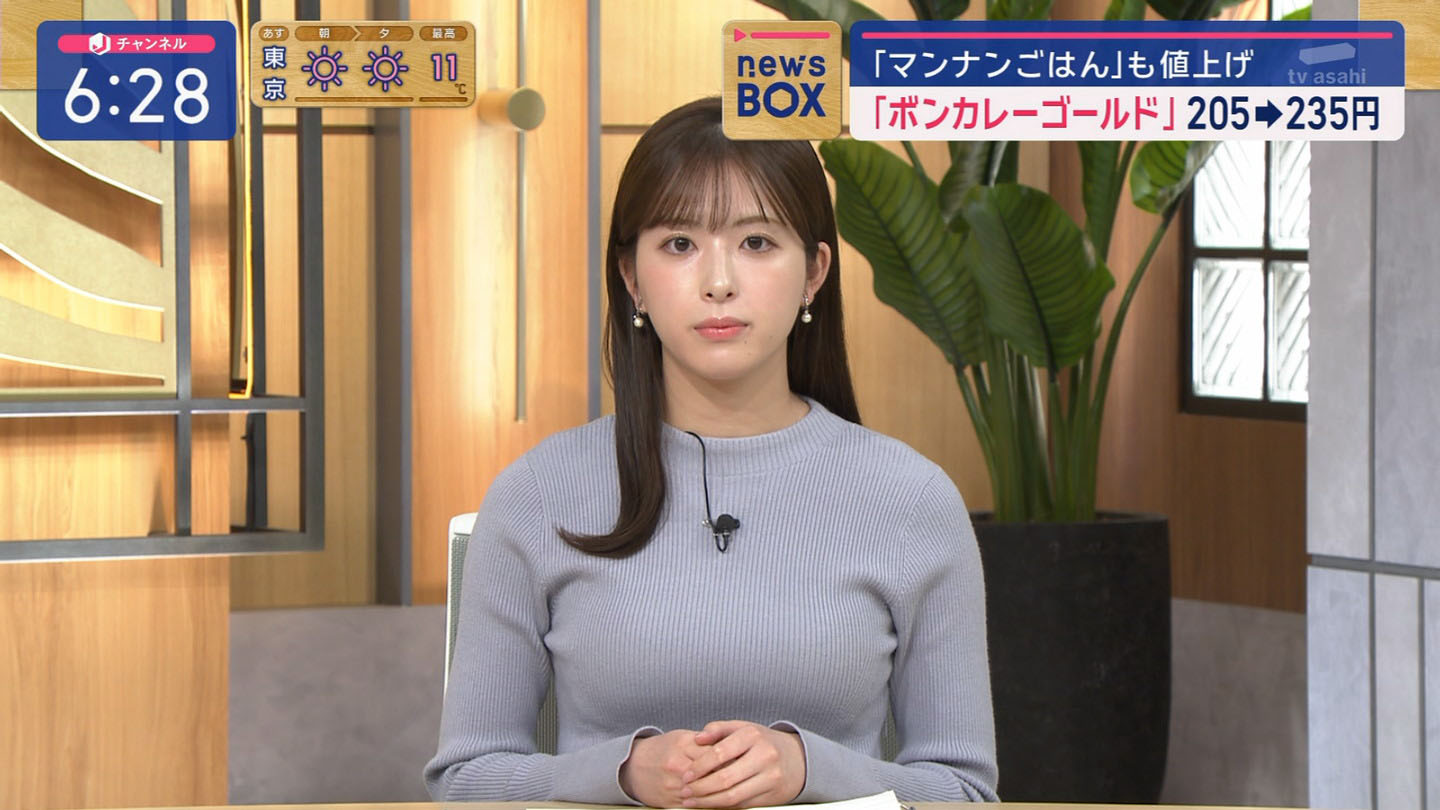 田原萌々アナ ピタピタのニットで激しく胸を強調、乗せ乳!!