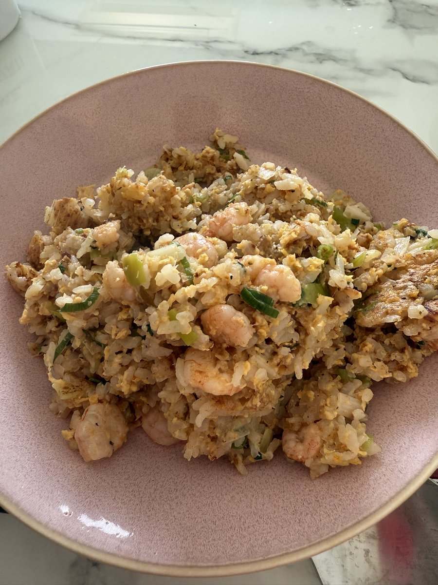 中川さんが「おうちでチャーハンつくるの下手すぎる」と添えて投稿した料理写真を見ると、エビやネギ、卵を具材としてごはんを炒めたようです。おいしそうですが、ごはんがパラパラにならずダマになってしまっています。