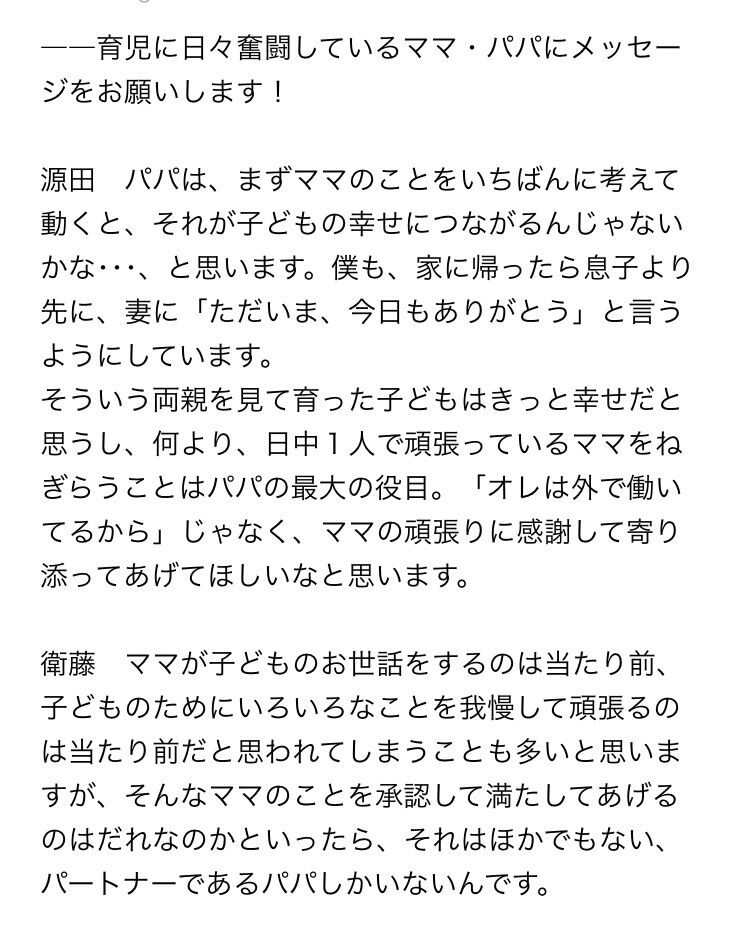 源田 パパは、まずママのことをいちばんに考えて動くと、それが子どもの幸せにつながるんじゃないかな・・・、と思います。僕も、家に帰ったら息子より先に、妻に「ただいま、今日もありがとう」と言うようにしています。