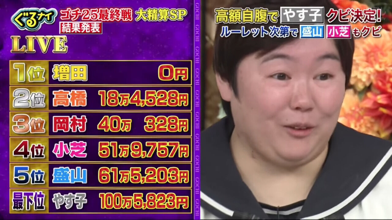 日本テレビ系バラエティー「ぐるぐるナインティナイン」の人気企画「グルメチキンレース ゴチになります! 25」が26日、4時間半スペシャルで放送された。「ぐるナイゴチ最終戦!大精算4時間半SP」内で、お笑いタレントのやす子(26)の“クビ”が決まった。