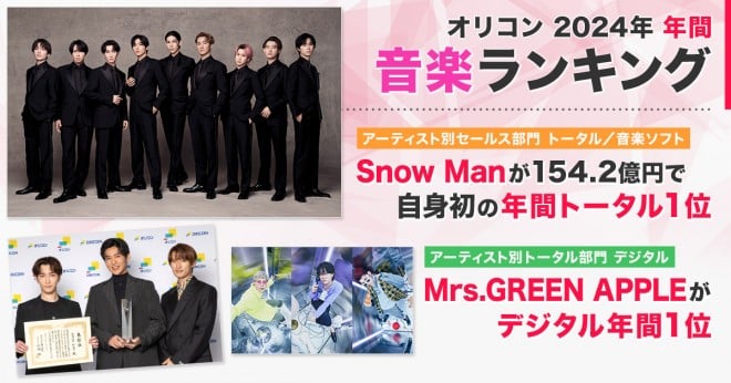 12月27日、「オリコン年間ランキング 2024」が発表され、「アーティスト別セールス部門」のトータルランキングで、男性アイドルグループ「Snow Man」が1位を獲得。