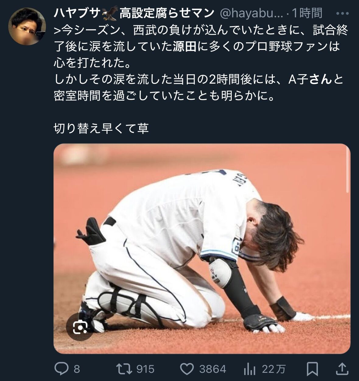 【悲報】西武ファンのウエンツ、源田の涙に見事に騙されていたwwww