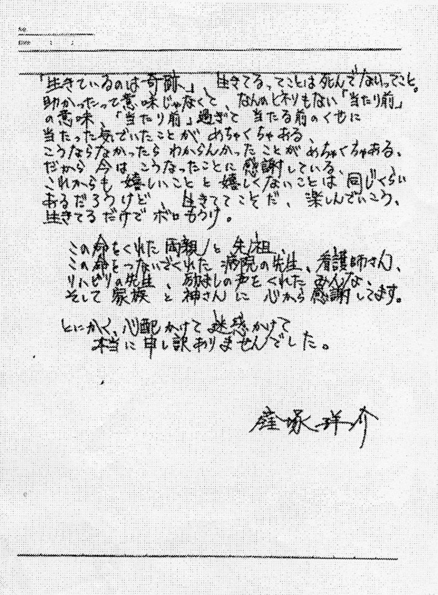 「いかんせん、いまだに何が起こったか分からなくて」といい「自分自身が勘違いして、調子に乗ってたっていうのはありますね。本当の人生は、マンションから落っこちたところから始まってると思うので。あれがなかったら今日を楽しく暮らせてなかったと思うし、感謝してますね」と語っていた。