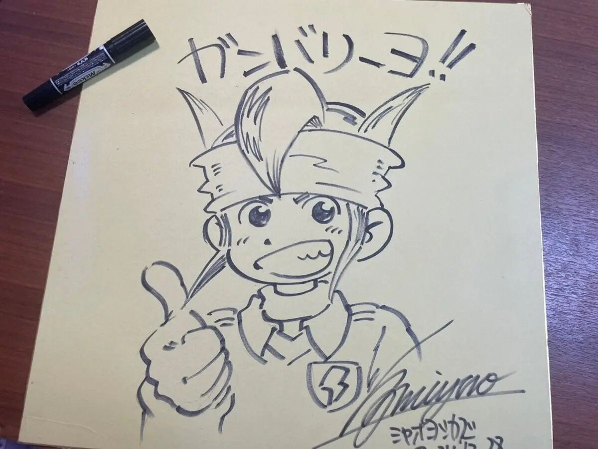 色紙には宮尾氏の直筆サインとともに「めざせ頂点を!」と記されている。あらに裏面には「オマケ」として、同作主題歌「立ち上がリーヨ」「つながリーヨ」にちなんだ「ガンバリーヨ!!」の激励メッセージとともに主人公のGK円堂守の姿も描かれた。「イナズマイレブンの円堂にように主将として自分も活躍したい」と鈴木。上田西イレブンが頂点を目指す