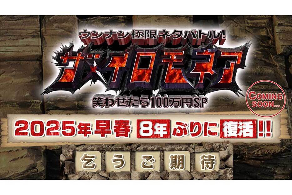 TBS系バラエティー『ウンナン極限ネタバトル ザ・イロモネア 笑わせたら100万円』が8年ぶりに特番として復活することが5日、分かった。番組公式Xで発表された。