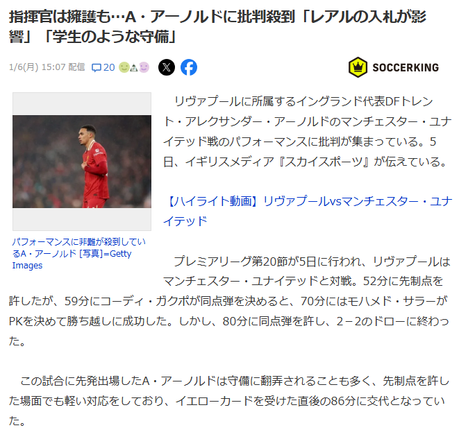 【悲報】アーノルドさんとかいう特級呪物いるのにプレミア首位のクラブwwwwwwwwww