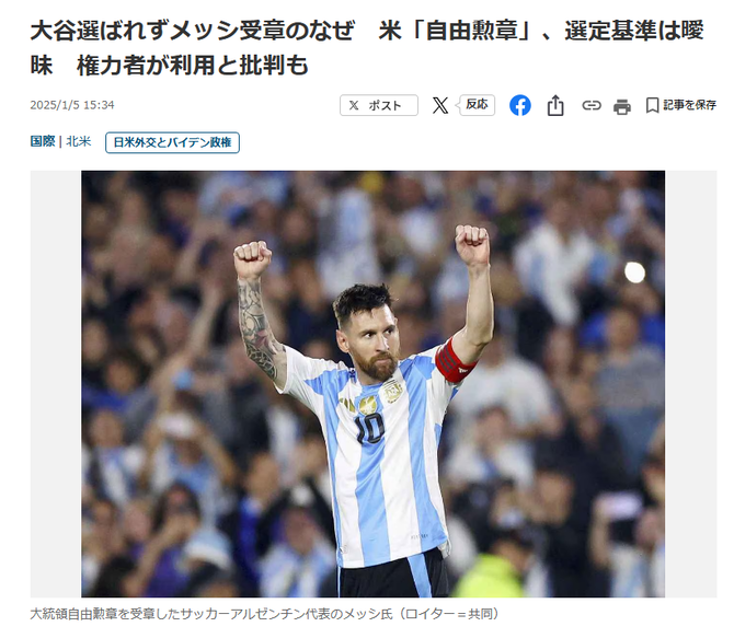 大谷選ばれずメッシ受章のなぜ 米「自由勲章」、選定基準は曖昧 権力者が利用と批判も