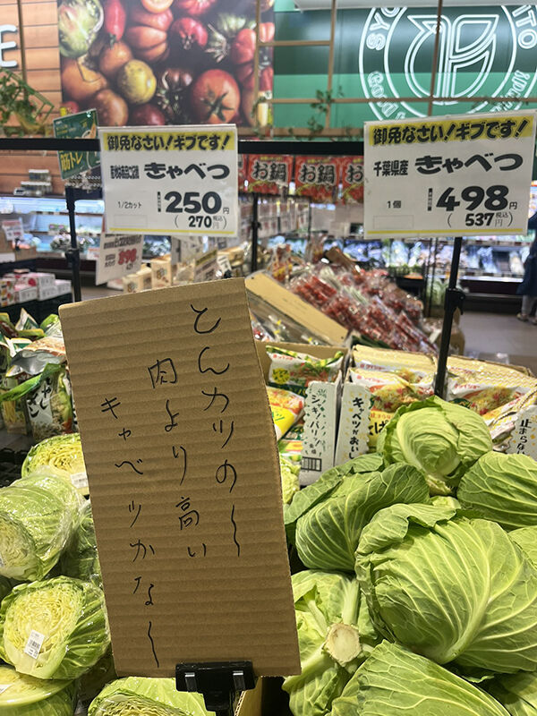 キャベツ売り場に置かれているのは、「トンカツの 肉より高い キャベツかな」という切ない一句!