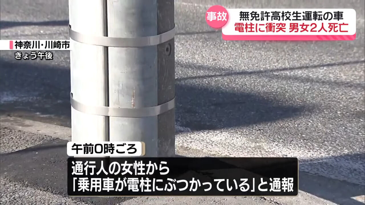 神奈川県警川崎臨港署によると、4人は友人同士で、現場は片側2車線の緩やかな右カーブ。車は曲がりきれずに横転し、電柱に衝突したとみられる。死亡した男子生徒は無免許で家族の車を運転していたという。同署で事故原因を調べている。