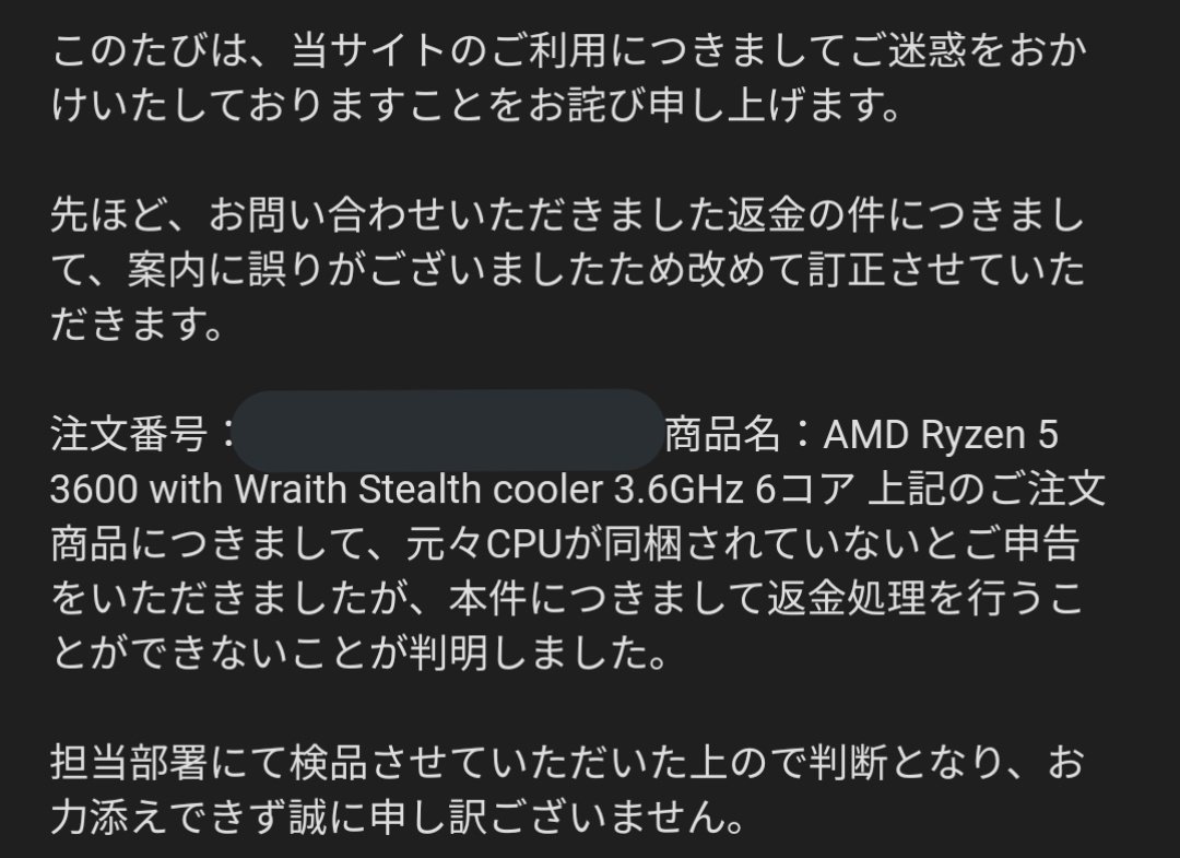 kumakumaさんと同様の被害を訴えるゼウスくん(@oreganyanko)さんからも話を聞いた。ゼウスくんさんは、過去にも同様の商品をAmazonから購入したことがあり、それまで中身を抜かれたことはなかったと説明する。しかし、10月28日に注文した商品は、前回まであったシュリンク包装がされておらず、商品本体にもCPUが入っていなかった。