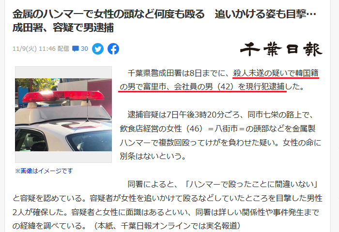 【韓国人犯罪】ハンマーで女性の頭など何度も殴る 追いかける姿も目撃… 成田署、容疑で韓国籍の男逮捕