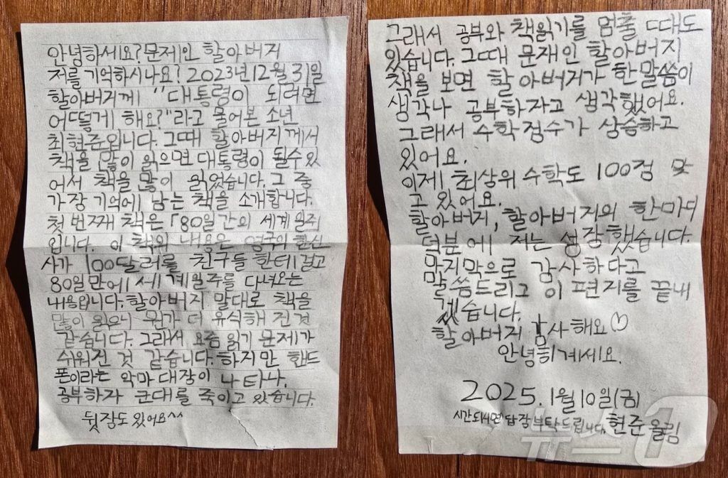 手紙を送ったのは小学4年生のチェ・ヒョンジュン君。手紙の冒頭では「こんにちは、ムン・ジェインおじいさん、僕を覚えていますか? 2023年12月31日に『大統領になるにはどうすればいいですか?』と尋ねた少年です」と挨拶した。
