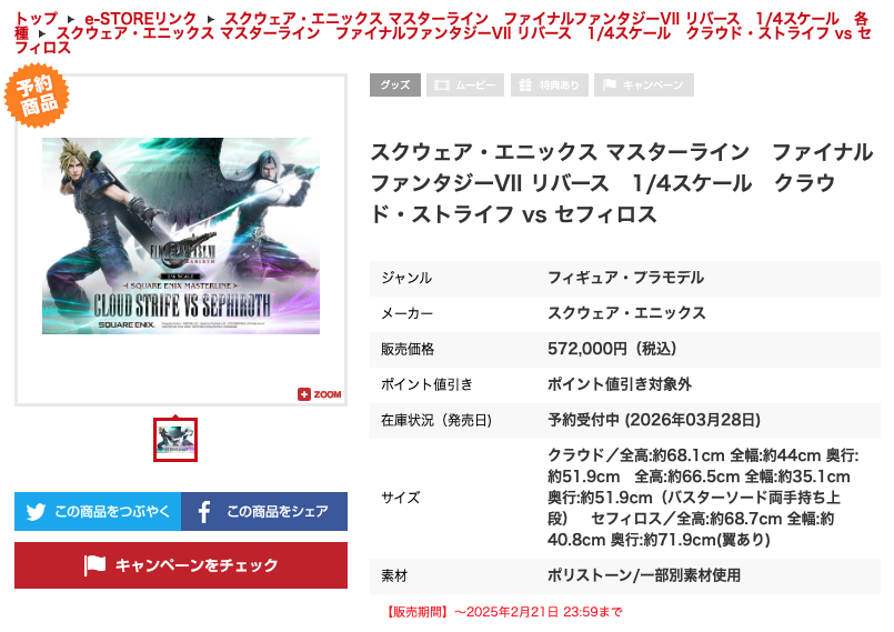 スクエニさん、『FF7』のフィギュアを572,000円で発売へ