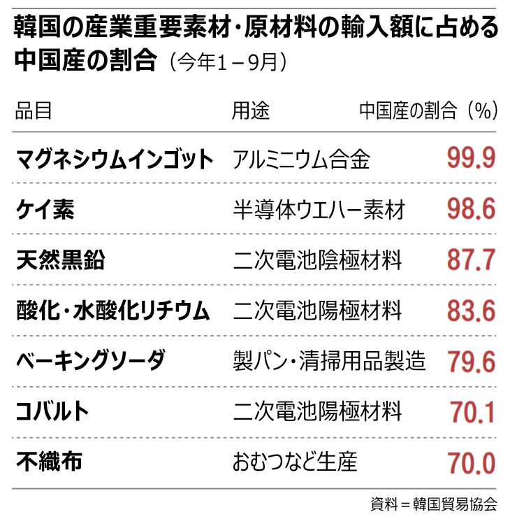 それだけではない。韓国の輸入品1万2586品目のうち特定国家への依存比率が80%以上なのが3941品目あり、うち中国が半分に迫る1850品目に上る。韓国の中核産業は実際に相当部分を中国産の原材料に依存している。半導体ウエハーの原料となるケイ素は中国から98.6%を輸入している。電気自動車用の二次電池の重要素材である陰極材料、陽極材料の製造に使われる天然黒鉛、酸化・水酸化リチウムも中国からの輸入が80%を超える。こうした素材は中国が供給をストップした瞬間、韓国国内の工場も操業を中断しなければならなくなる可能性が高い。