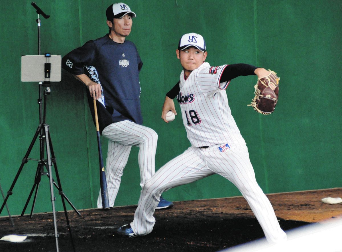 練習開始時は雨が降ったりやんだりする空模様の中、午前11時過ぎにはグラウンドのシートが取り除かれた。奥川は矢崎、清水に続いてマウンドへ。直球に変化球も交えて浜田、オスナ、長岡、岩田、丸山の打者5人に約6分間、計22球を投げた。