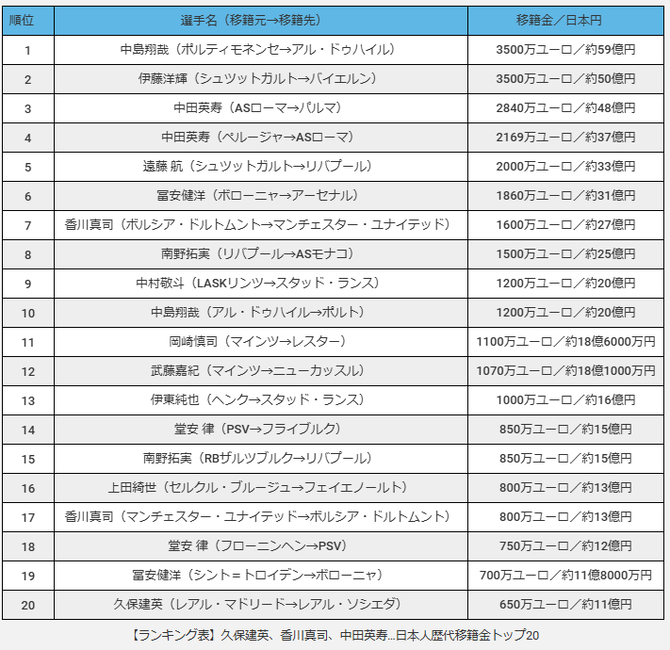 今よりも移籍金の相場が安かった25年前の中田を超えているのが中東中島とバイエルン伊藤だけなんだよな時代を考えると中田の移籍金は今なら1億ユーロクラスやろ