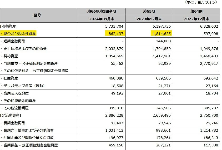 資産の部の「現金及び現金性資産」が激減しているのです。2023年12月末には「1兆8,146億ウォン」あったのですが、
