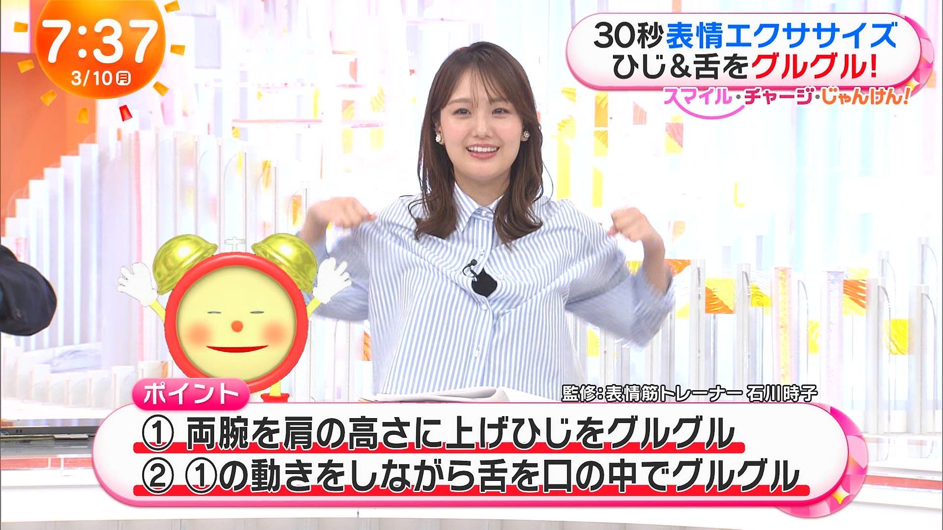 胸を張りながら腕を回すストレッチの最中に、胸のボタンが外れて中が見えてしまった井上清華アナです! ボタンが外れる決定的瞬間もGIF動画&明るさ調整版付きで! [2025年3月10日 めざましテレビ]