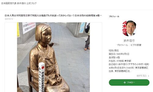 鈴木は2012年6月、ソウル鍾路(チョンノ)区の駐韓日本大使館前に設置された「平和の少女像」に、「竹島は日本の領土」と書かれた杭を縛り付け、慰安婦被害者の名誉を毀損した容疑などで2013年に起訴された。