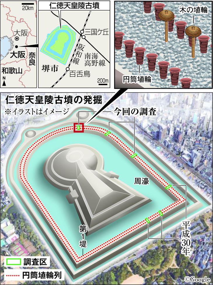 仁徳天皇陵古墳 令和元年に世界文化遺産に登録された百舌鳥(もず)・古市(ふるいち)古墳群の一つ。墳丘は3重の周濠と2重の堤に囲まれている。墳丘の長さは大正時代の測量に基づいて486メートルとされているが、宮内庁による近年の調査で築造当初は少なくとも525メートルあったことが分かった。周濠などでは明治以降、巫女(みこ)や馬をかたどった埴輪などが見つかっている。