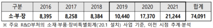 素部装の研究開発予算は2019年に9646億ウォン→ 2021年に2兆1042億ウォンで二倍以上増え、素部装特別法など法制度整備も行われた。