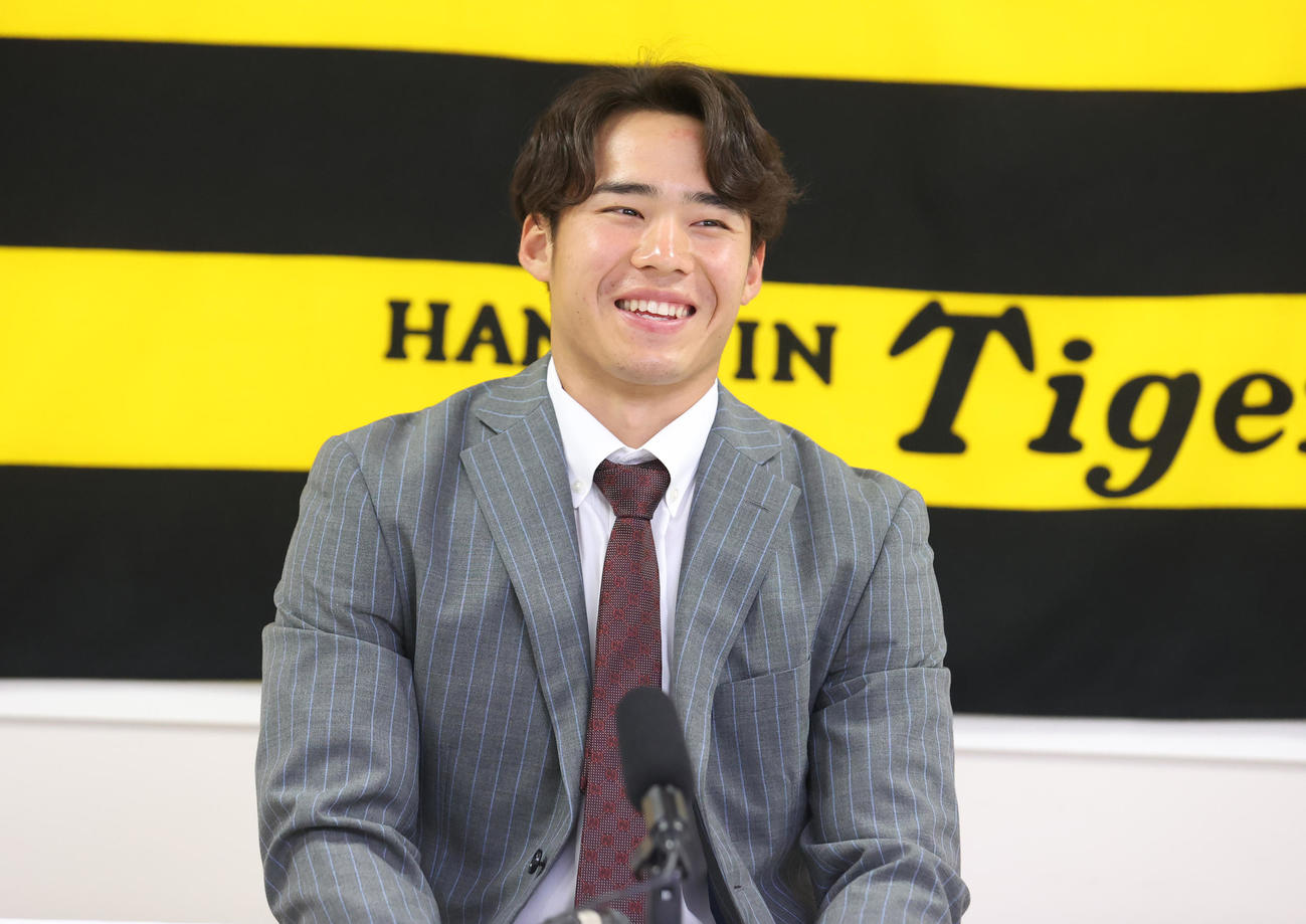 契約更改を終え、会見する遠藤成(代表撮影)― スポニチ Sponichi Annex 野球