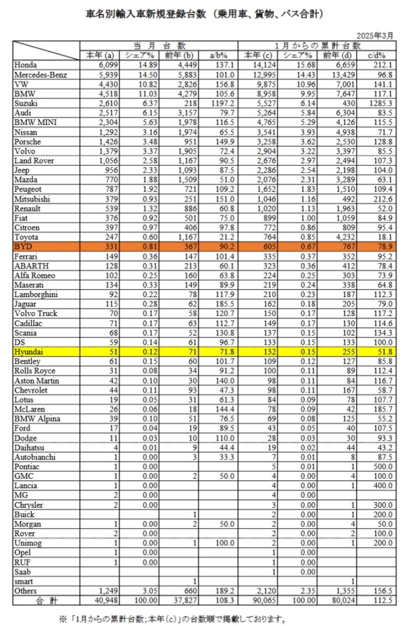 『BYD』は「331台」ですから、少なくとも『現代自動車』の約6.5倍売れています。ただし、単月で見て前年の「90.2%」、01~03月累計で見ると前年の「78.9%」と、『現代自動車』と同様、前年よりは売れていません。失速です。