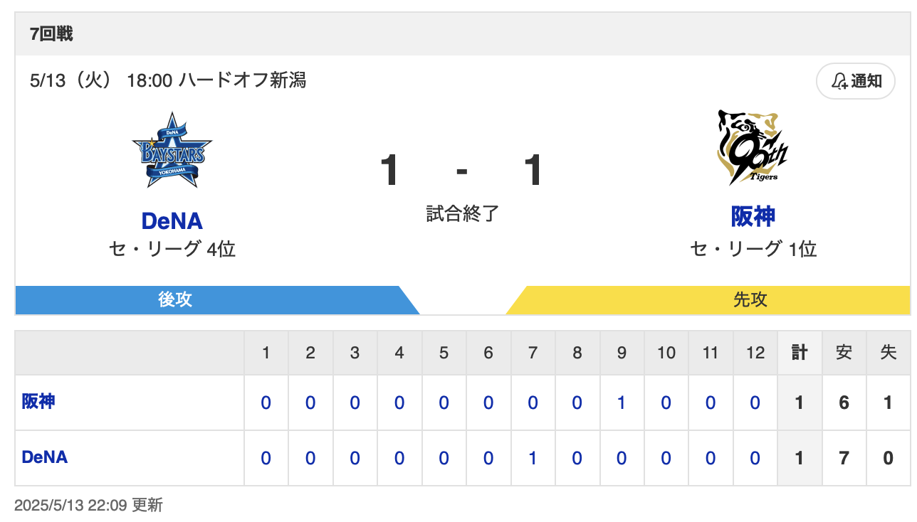 【試合結果】DB 1-1 T [5/12] DeNA-阪神は延長12回引き分け 高寺が9回2死で同点HR