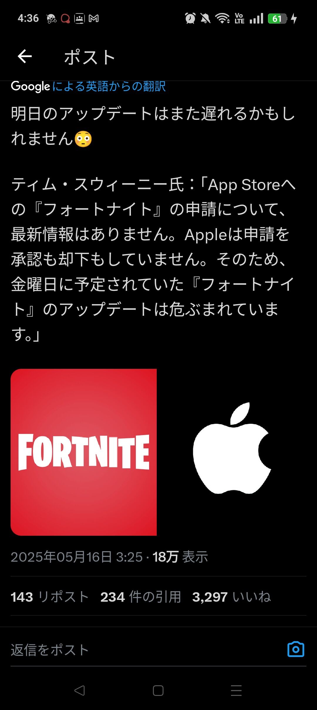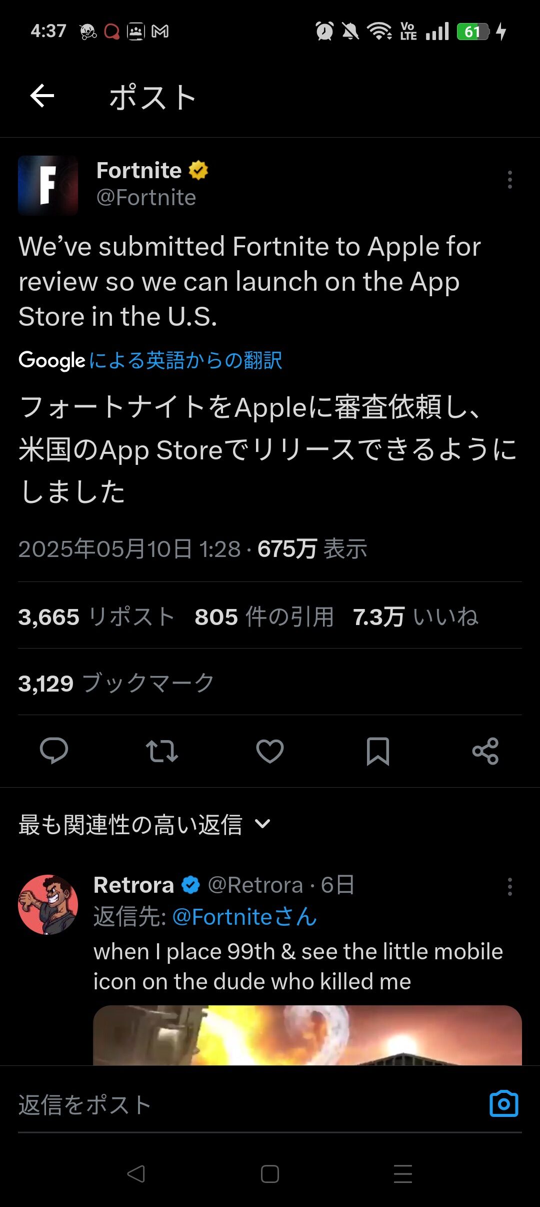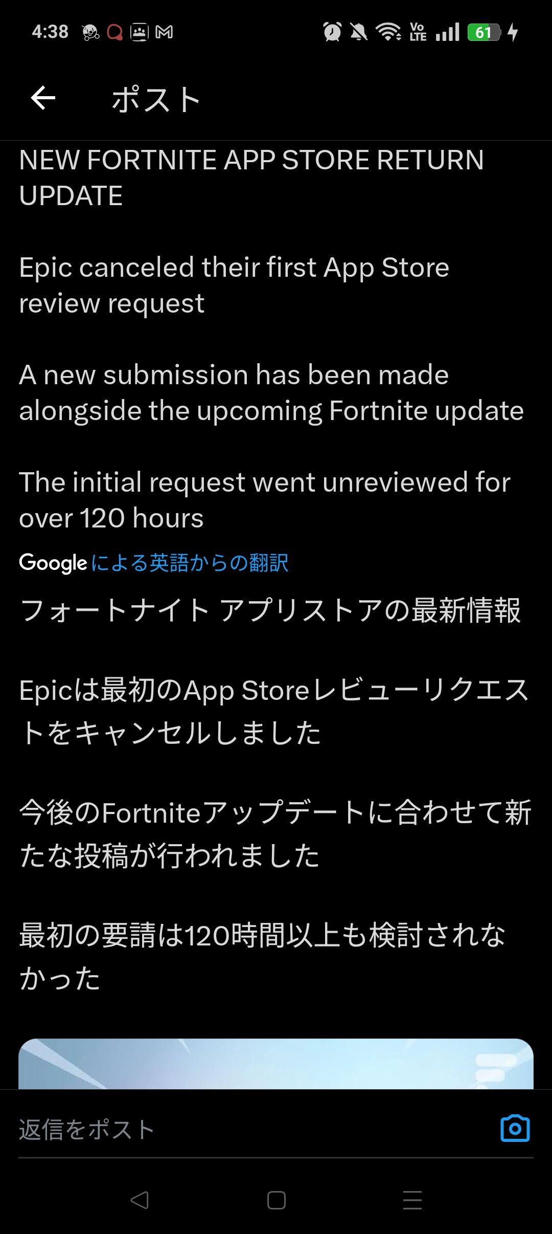 ↓ EPIC「まだ審査通ってないけど明日のアプデに合わせるために新しいバージョンのアプリを再申請した」(1日前)