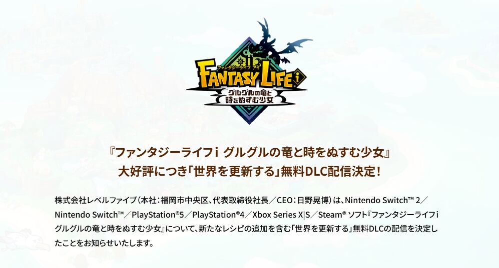 『ファンタジーライフiグルグルの竜と時をぬすむ少女』大好評につき「世界を更新する」無料DLC配信決定!
