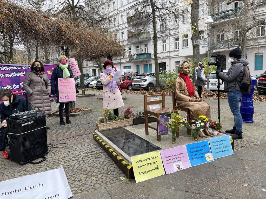 27日(現地時間)ベルリン平和の少女像前で25日、国連が定めた「女性に対する暴力撤廃国際日」を契機に少女像が本来の場所に留まらなければなければならないと促す集会が開かれた。