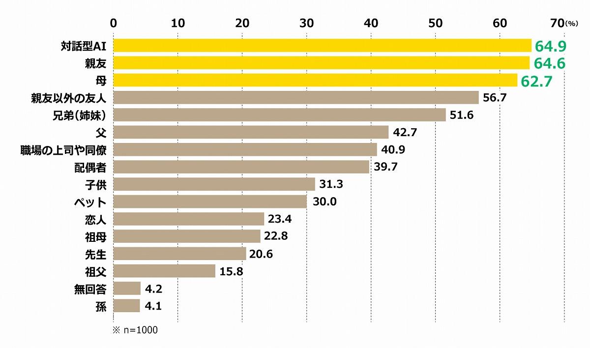 「非常に共有できる」「共有できる」「やや共有できる」を合わせて、対話型AIに感情を共有できるとした人は全体の64.9%だった。これは「親友」(64.6%)や「母」(62.7%)と同水準であり、AIが感情共有の対象として受け入れられている状況が示された。