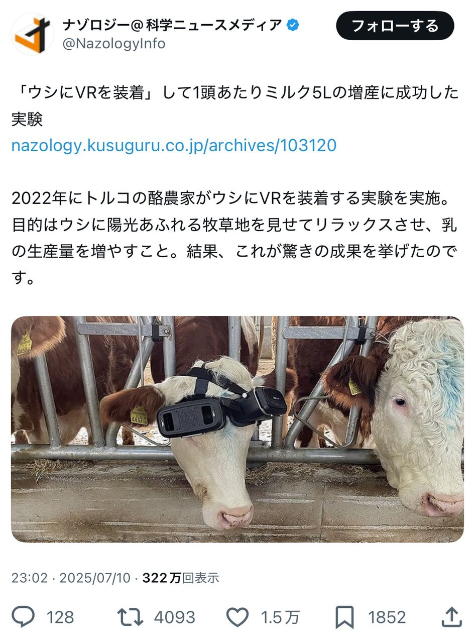 【画像】ウシさん、バーチャルリアリティを見せつけられてミルクを搾られてしまう