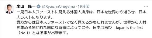 米山氏は10日、「さすが立憲民主党です 日本人ファーストには断固反対!」とつづる一般ユーザーの投稿を引用。その上で「一見日本人ファーストに見える外国人排斥は、日本を世界から遅らせ、日本人ラストになります。貴方からは日本人ファーストでなく見えるかもしれませんが、世界から人材を集める開かれた国になる事によってこそ、日本は再び Japan is the first(No.1)となる事が出来ます」とつづった。