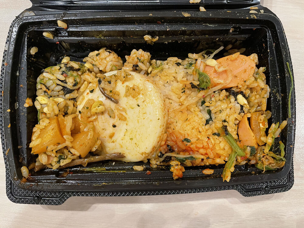 その目玉商品のひとつが、「シャカシャカ弁当」(648円)です。プラスチック容器を開けると、ご飯の上に目玉焼きやナムル、キムチなどの具材がトッピングされています。彩りもよく、この時点で普通に美味しそうなのですが……これを手で思いっきり振って食べるのが本場流とのこと。